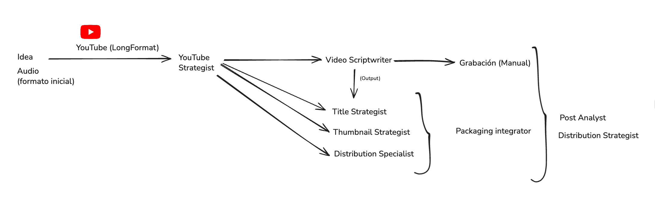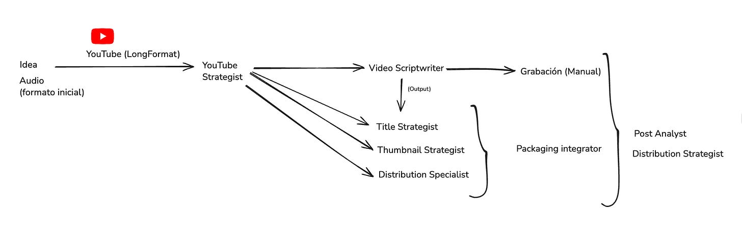 luego entra el Packaging Integrator (un agente evaluador), que se asegura de que título, miniatura, mensaje del video cuenten la misma historia.Publicación → Análisis → Distribución